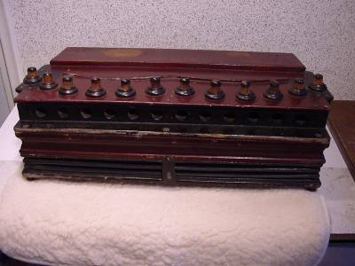 Voetbas Voetbas met bijbehorende accordeon (trekzak). Voetbas melodiekant bijbehorend bij de voetenbas.jpg